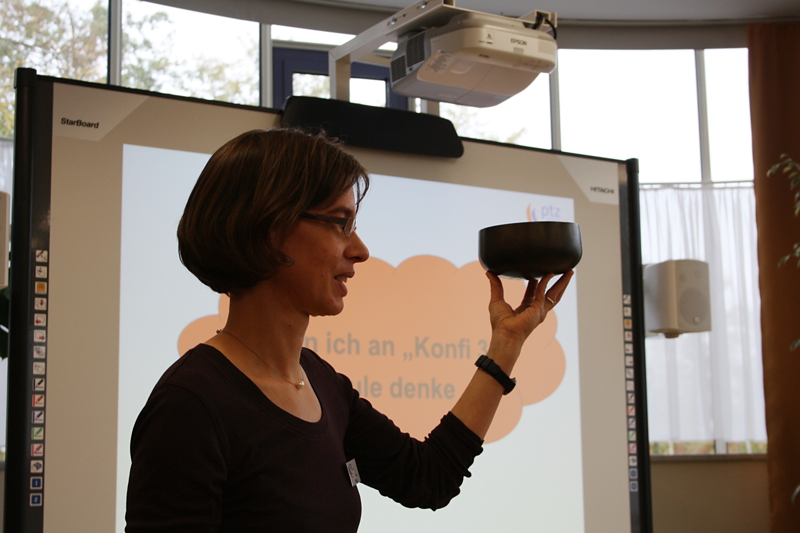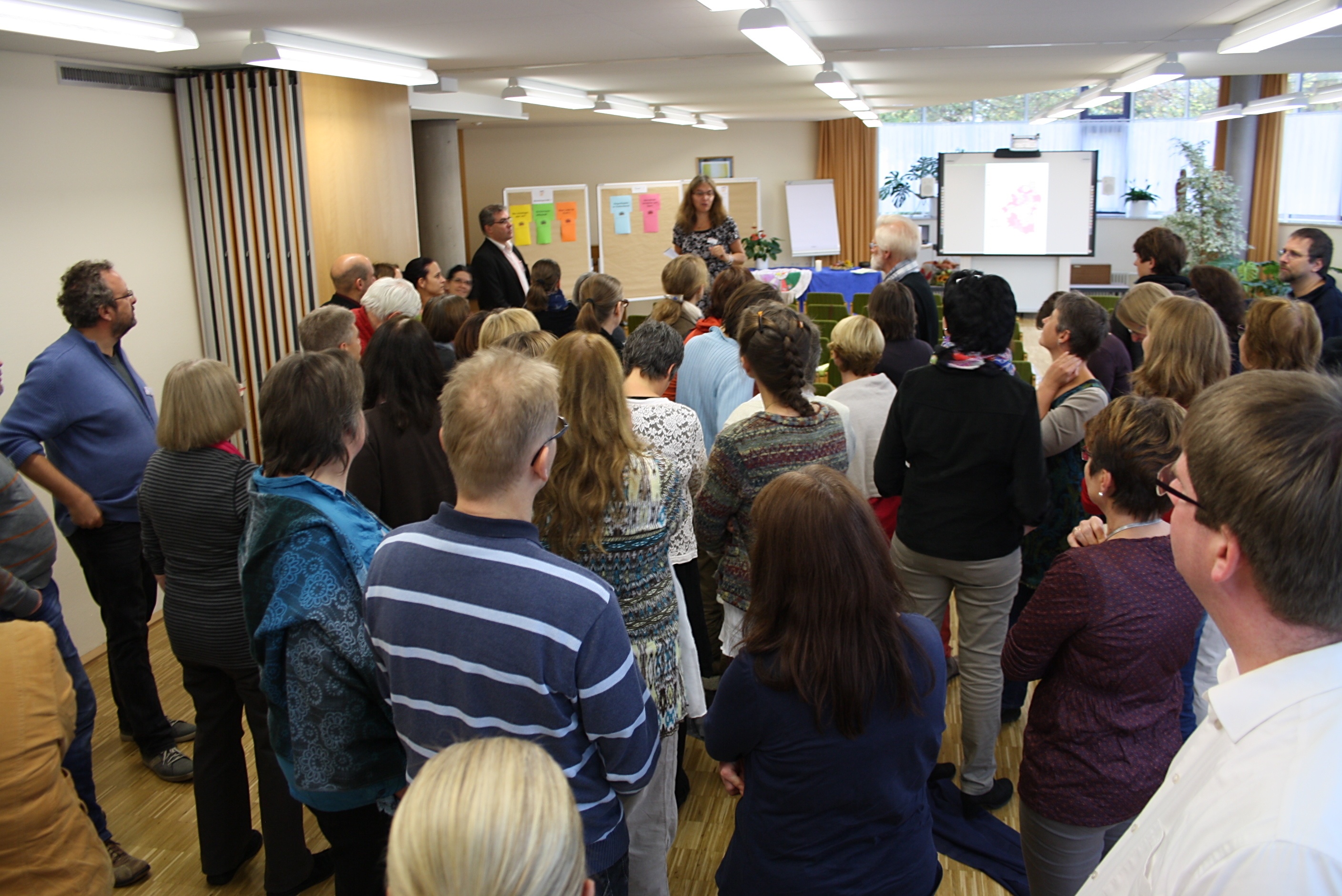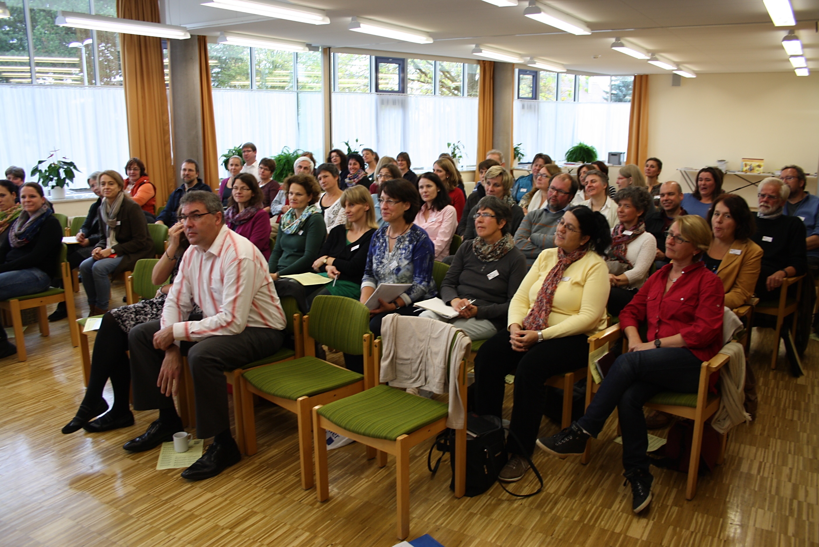 Gut 60 Teilnehmende, Ehrenamtliche und Pfarrer/innen bunt gemischt, waren wir beim Studientag Konfi 3 im Haus Birkach am 25. Oktober 2014. Das Thema lautete „Konfi 3 und Schule“ (vgl. den Programm-Flyer). Damaris Knapp, Dozentin für Grundschule am ptz Stuttgart zeigte anschaulich, wo die Herausforderungen liegen, wenn man eng mit der Schule kooperiert. Susanne Jasch stellte ihr Waldenbucher Modell vor, das beim Feedback beste Noten bekommen hat. Weil Grundschulen sich immer mehr in Richtung Ganztagesschulen entwickeln, wird auch die Konfi 3-Arbeit nicht darum herum kommen, enger mit örtlichen Grundschulen zu kooperieren. Auch dort können – wenn die Schulleitung einverstanden ist – Eltern einbezogen werden. Freilich darf der Lernort Gemeinde nicht vernachlässigt werden, der durch Großgruppentreffen und Konfi 3-Gottesdienste erlebbar wird.